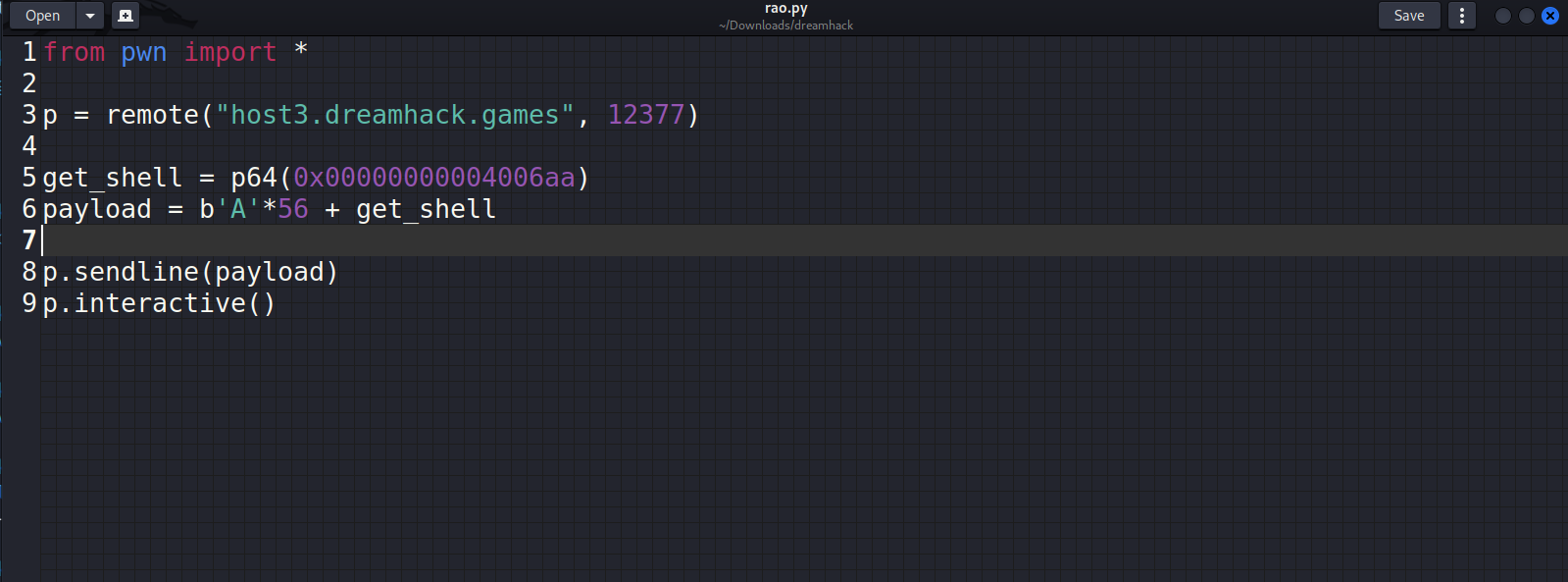 그다음 바로 get_shell 함수 주소를 return 주소에 넣어서 쉘을 획득한다.