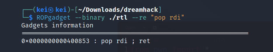 여기서 이 방법의 중요한 키 포인트는 rdi를 '/bin/sh' 값으로 설정해야 된다는 점인데 이를 위해서 "리턴 가젯"을 이용합니다.